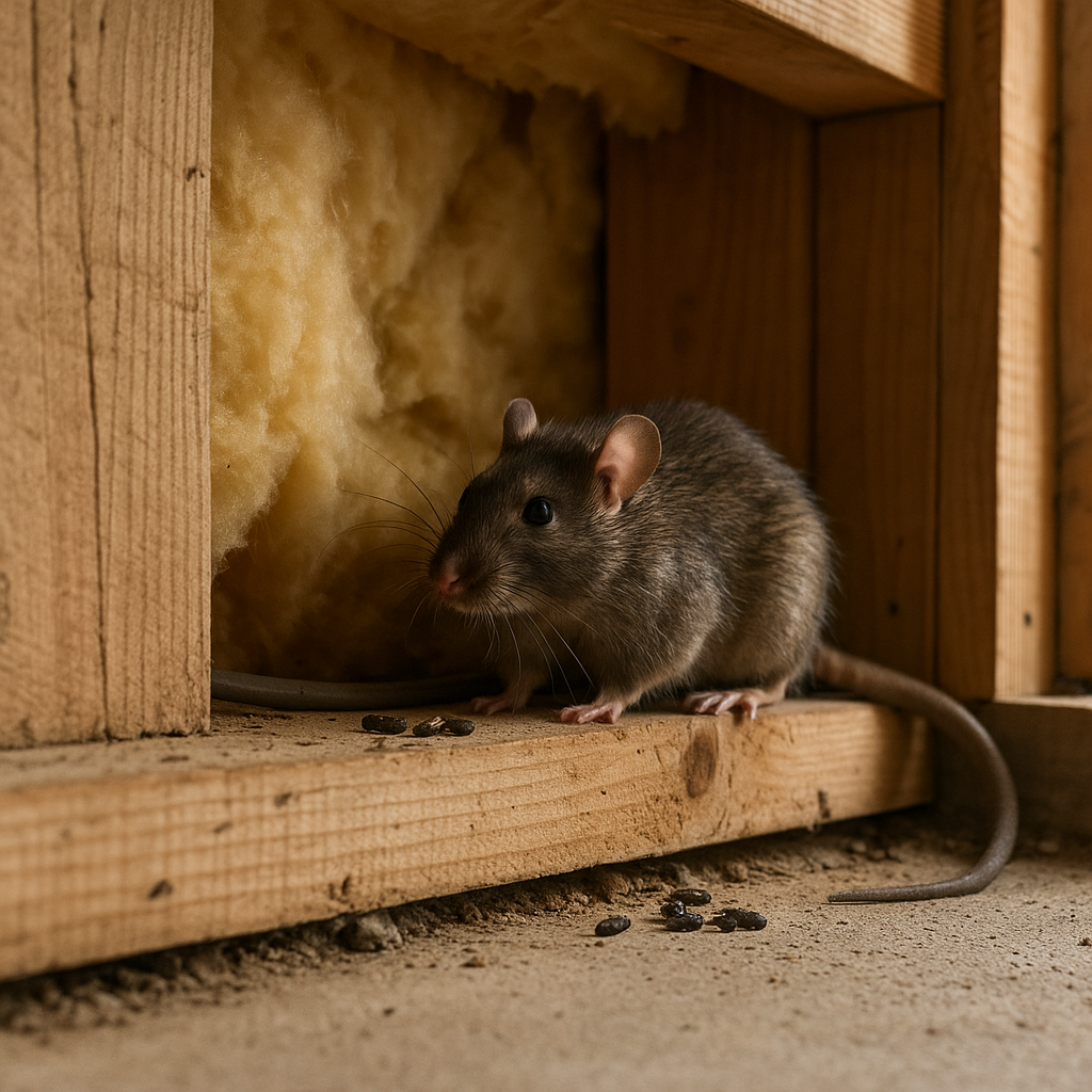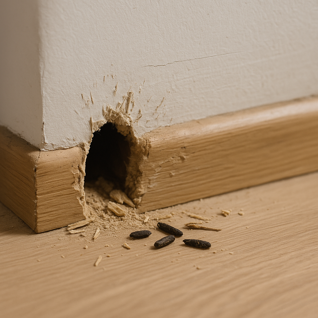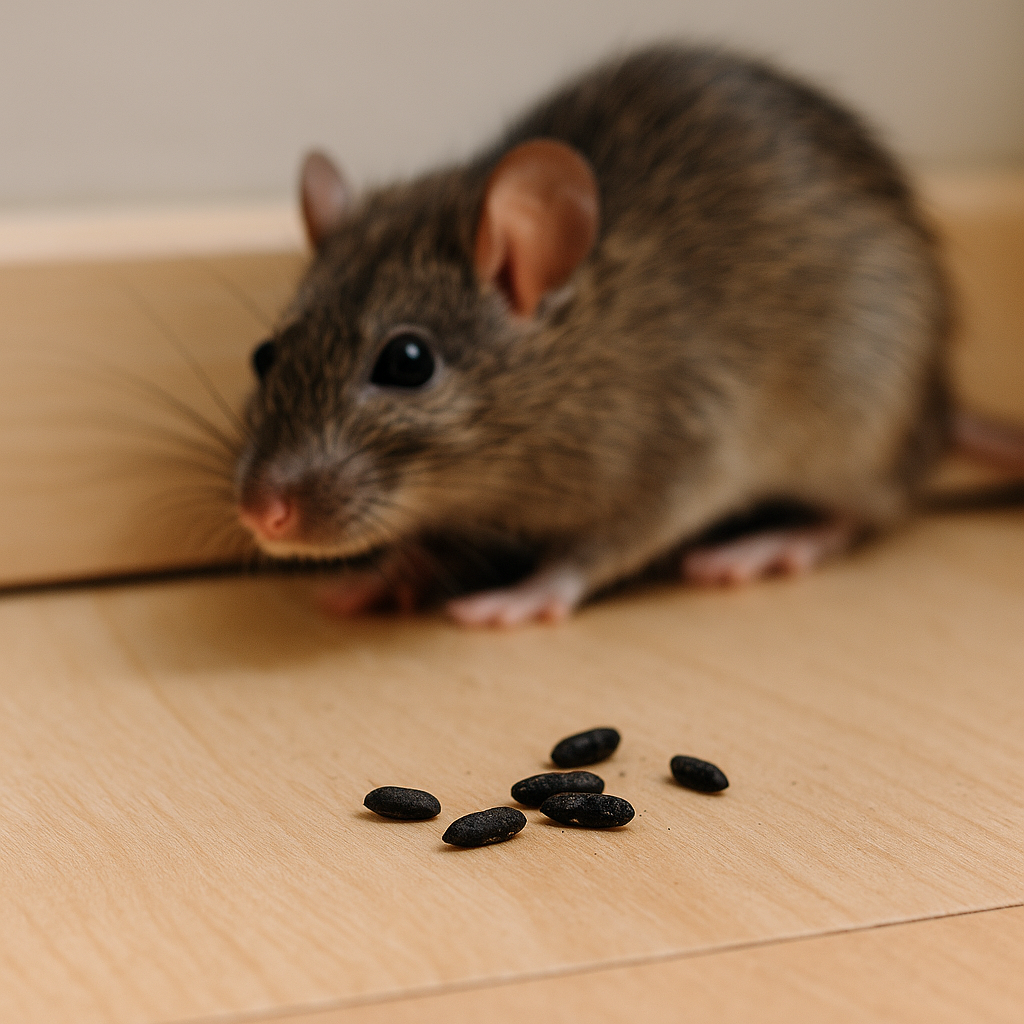 Petites crottes noires (3 à 6 mm) et odeur persistante près des garde-manger, plinthes ou électroménagers.